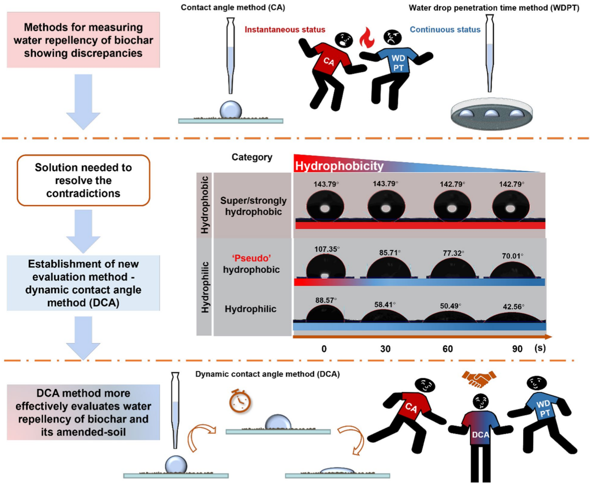 针对这一难题,中国科学院新疆生态与地理研究所中亚干旱区生态系统监测与变化李耀明研究团队,通过17种标准材料和18种生物炭的系统测试,提出动态接触角(DCA)法,追踪90秒内接触角变化,并引入“假性疏水”概念,从概念上整合了瞬时疏水与持续疏水特征,克服了传统方法的局限性,为干旱半干旱地区生物炭改良土壤的水分管理和环境应用提供了更精准的评价工具。