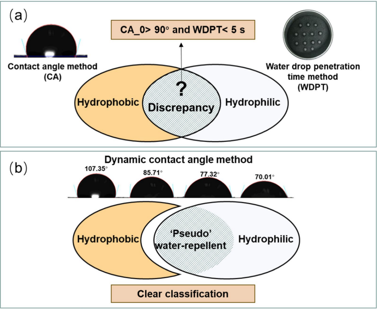 土壤疏水性的主流评价方法包括接触角(CA)法和水滴渗透时间(WDPT)法。CA法测量瞬时疏水性,而WDPT法反映持续疏水性,两者时间维度不一致导致矛盾结果频发,如部分土壤改良材料用CA法测试接触角大于90°,代表疏水,但WDPT法测试小于5秒又指向亲水,这些矛盾在土壤疏水性评价和土壤的水分管理研究领域属于方法学上的国际难题。