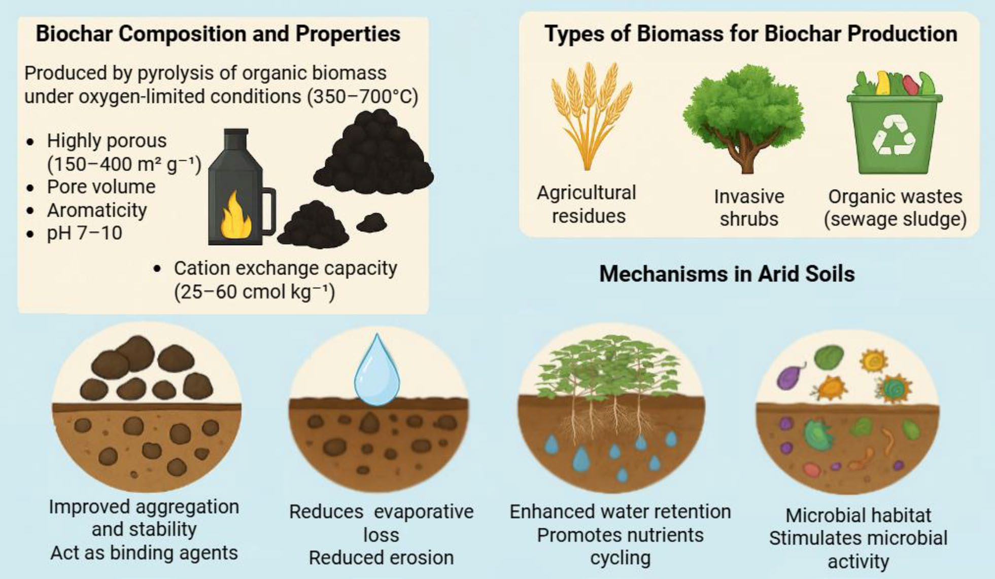 随着气候变化加剧与人类活动干扰,全球干旱与半干旱地区正面临严峻的土壤退化与荒漠化威胁。这些地区降水稀少、蒸发强烈,土壤有机质含量极低(通常低于0.5%),并普遍存在盐碱化、结构崩解等障碍,严重制约农业生产和生态安全。传统依赖矿物肥料强化灌溉的改良模式不仅效果有限,反而可能加剧土壤盐渍化和次生退化。因此,探索兼具生态效益与气候适应性的可持续土壤管理策略成为当前研究热点。生物炭作为一种由生物质在限氧条件下热解制备的富碳材料,因其独特的理化性质,在改善土壤结构、提升水肥保持能力、促进微生物活性及固碳减排等方面展现出巨大潜力,被视为应对旱地土壤退化的气候智能型解决方案。