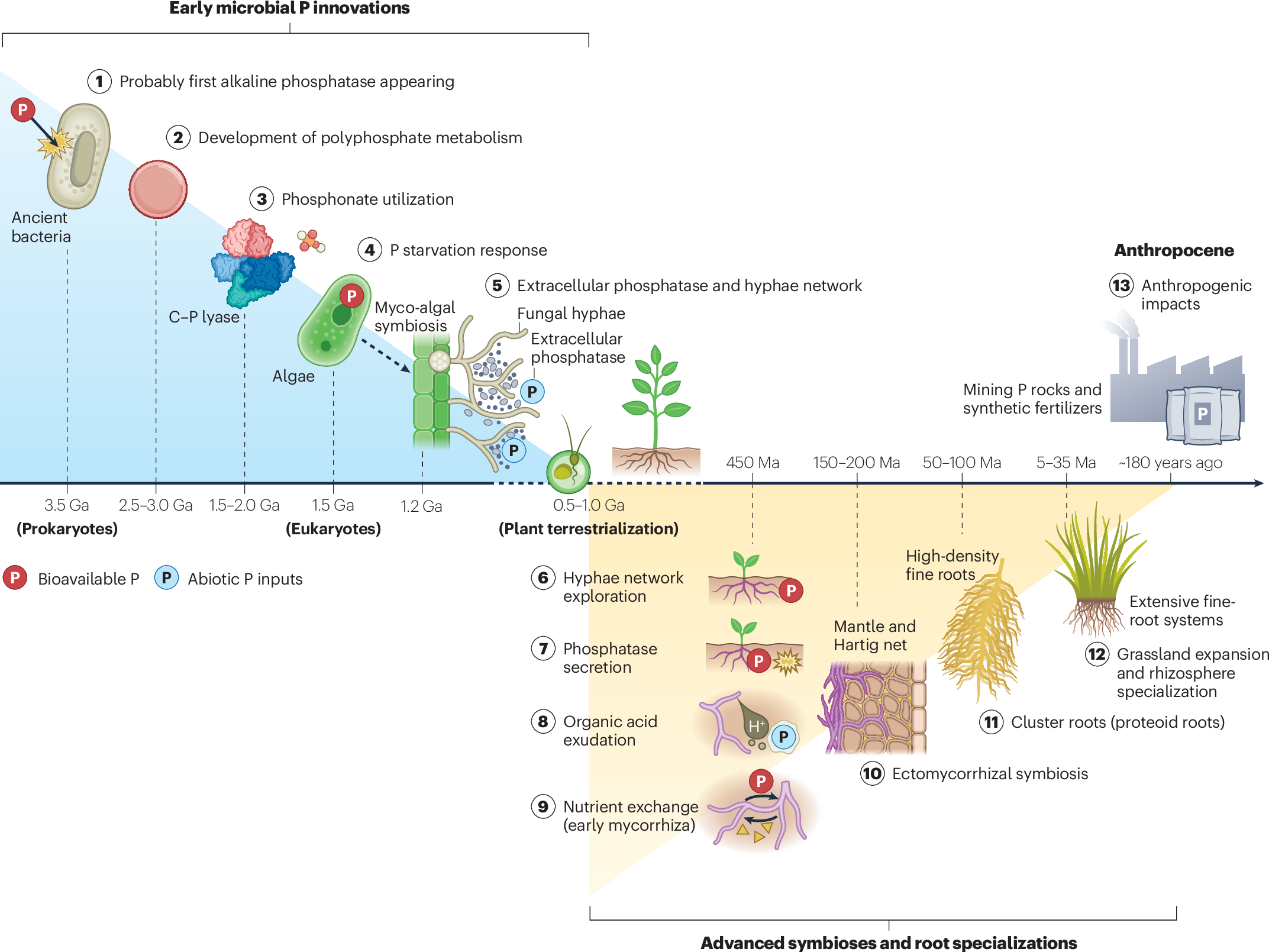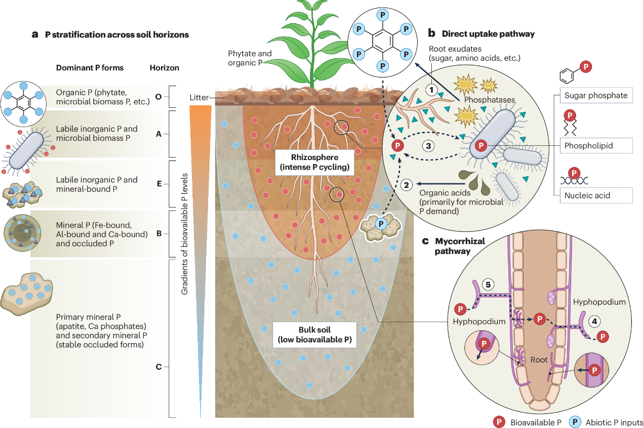 a,土壤剖面中磷形态的垂直分层;b,三种关键微生物机制通过直接吸收途径提高磷的有效性;c,菌根途径通过真菌共生促进植物对磷的吸收