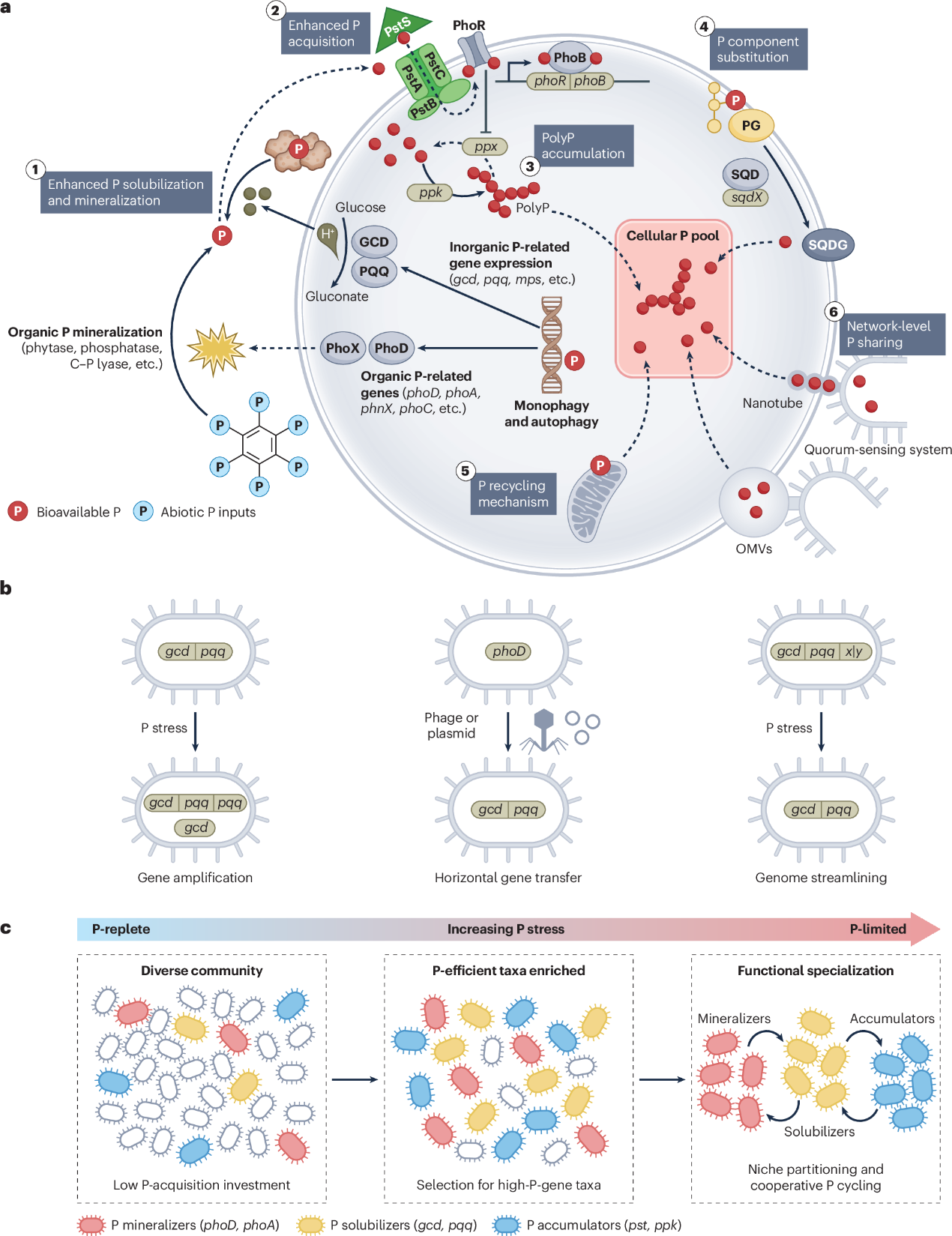 a,缺磷条件下的细胞适应机制;b,基因组演化与对长期磷胁迫的适应;c,由基因组适应驱动的群落水平功能转变